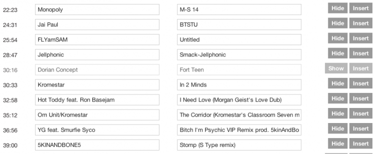 4. You can tweak the track information in your Playlist by clicking the Edit Tracks button. You can toggle which tracks were played in your Playlist and edit track and artist information. You can also use the Insert buttons to add tracks that were not logged to your History session (eg. tracks you played off CD or vinyl.)