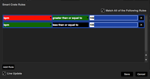 Below I have applied rules so that this crate will contain tracks with a BPM of 102-105: